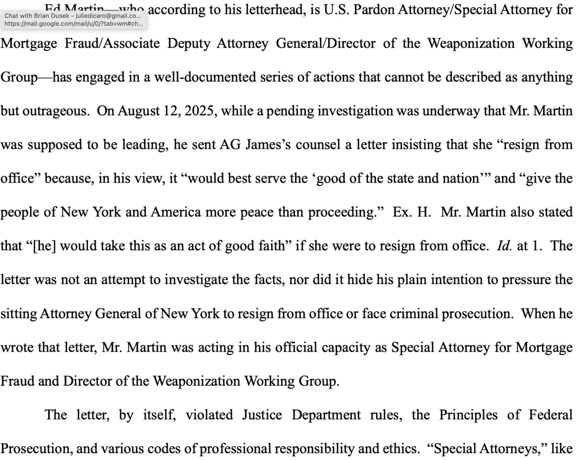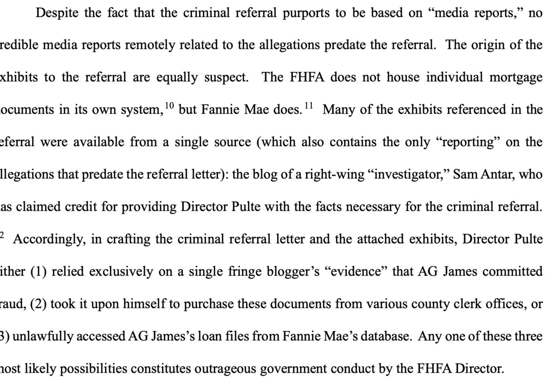 Yesterday, James filed a motion to dismiss the charges for “outrageous government conduct,” and it’s juicy as all get-out. I did an in-depth thread on it here, but let’s hit the highlights. Spoiler alert: This thing hits both Bill Pulte and Ed Martin delightfully hard.