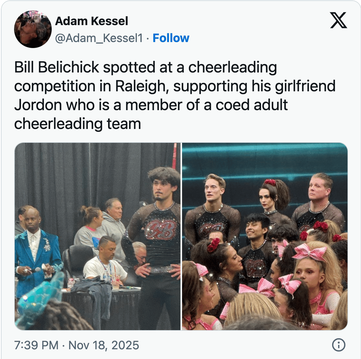 Hands down, my favorite story over the last week was Bill Belichick going to a cheerleading competition to root for his girlfriend, an adult cheerleader.