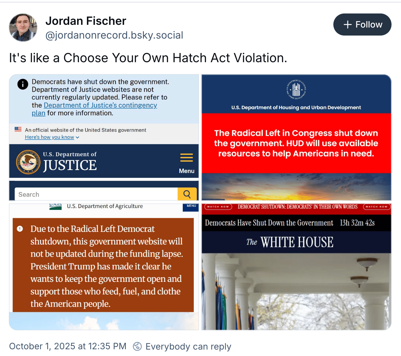 Those screengrabs are from the Department of Justice, the Department of Agriculture, the Department of Housing and Urban Development, and the White House, all in blatant violation of the Hatch Act. Yesterday, I highlighted that federal employees got a memo directly from the Trump White House that instructed them to blame the shutdown on Democrats. Over at the Department of Education (or what little of it remains), employees were shocked to learn that their non-partisan “out of office” messages were changed, without their knowledge, to denigrate Democrats.