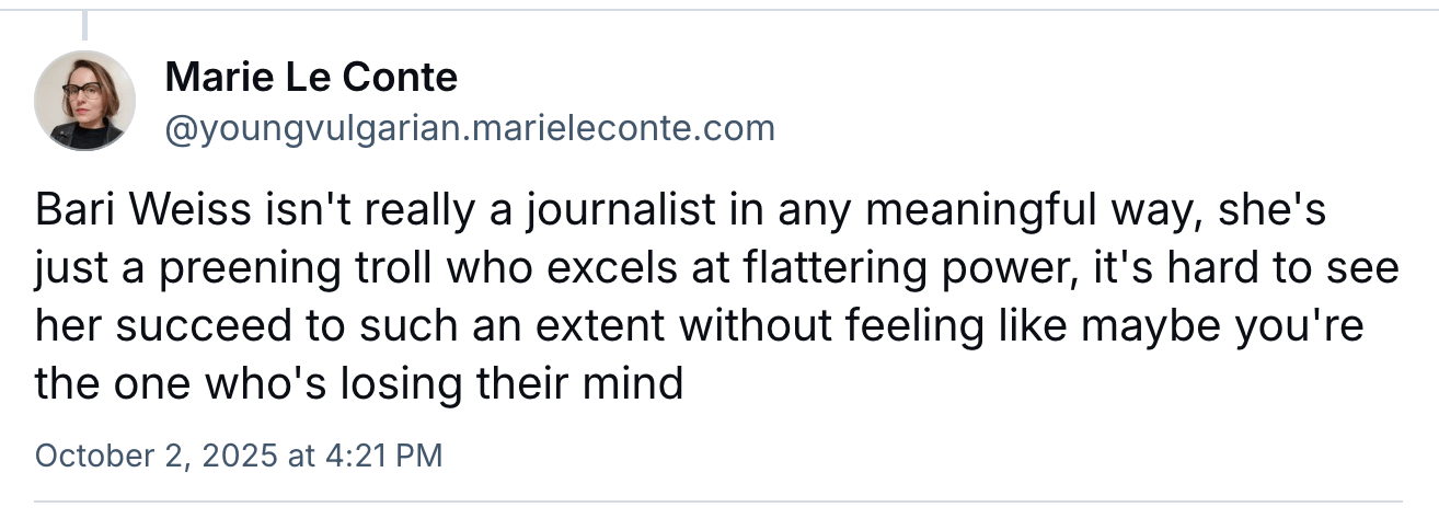 If you don’t know who Bari Weiss is, it’s hard to explain her. She made her name as an (extremely mediocre) NYT columnist, who whined regularly about her freedom of speech being infringed upon (while writing for the NYT) and tried to get university professors she disagreed with fired. Weiss is the kind of person you come to roll your eyes at after years of seeing her horrible takes on everything elevated to the national discourse.