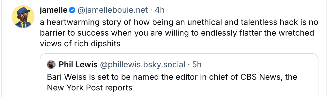 But CBS bested them all, settling yet another lawsuit with Trump (this time, over a 60 Minutes interview) to ensure that a Trump-controlled FCC would approve owner Shari Redstone’s Paramount merger with Skydance studios. CBS then proceeded to cancel The Late Show, hosted by regular Trump critic Stephen Colbert, and, somewhere along the way, alienated the executive producer of 60 Minutes, who announced that the show — the gold standard in investigative journalism for decades — had lost its journalistic independence on his way out the door.