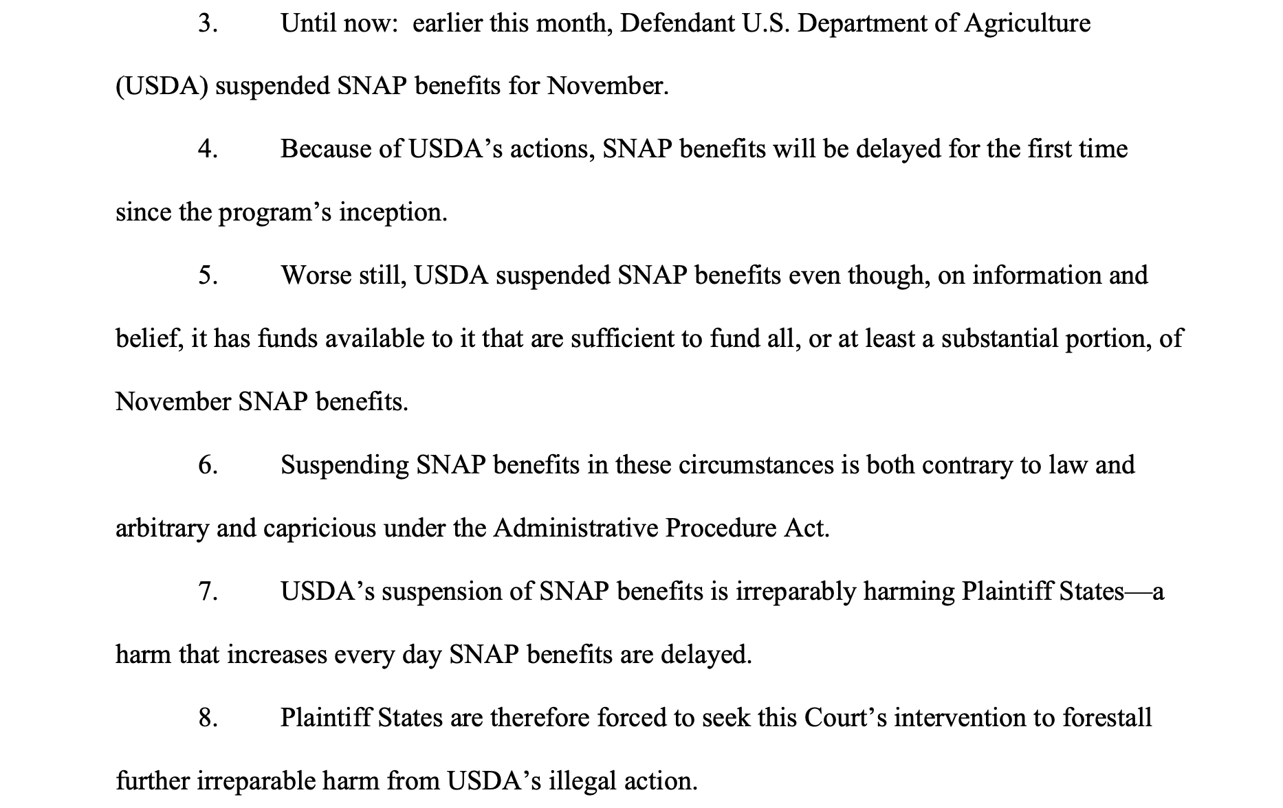 The continued issuance of SNAP benefits is mandatory. Neither a lapse in appropriations nor a government shutdown alters this requirement. Indeed, for years, and as recently as four weeks ago, the U.S. Department of Agriculture (USDA) consistently maintained that SNAP benefits will continue in the event of a shutdown because SNAP is a “core program” of the nutrition safety net.” Yet on October 10, 2025, USDA without explanation changed course and directed state SNAP administrators to refrain from transferring massive state benefits data files to SNAP card vendors, without which SNAP benefits cannot be processed and paid. Then, on October 24, USDA suspended SNAP benefits altogether for November 2025. It provided no explanation for the suspension, or for its refusal to use available resources to fund SNAP.
