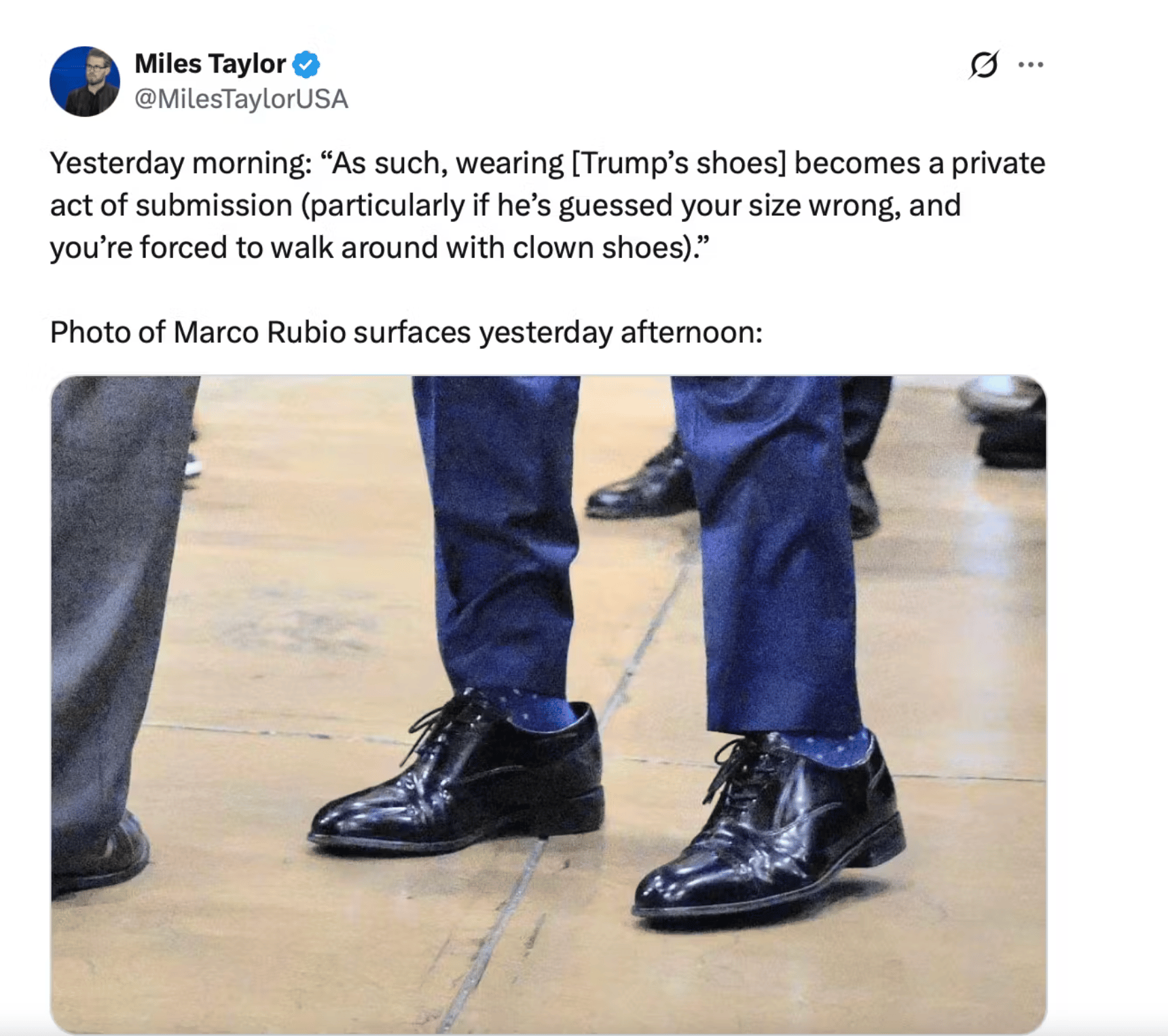 First, I can guarantee you that Trump doesn’t know that Florsheim is a Chicago company, and secondly, given that he spent his entire campaign calling him “Little Marco,” you would think Trump would err on the smaller side.
