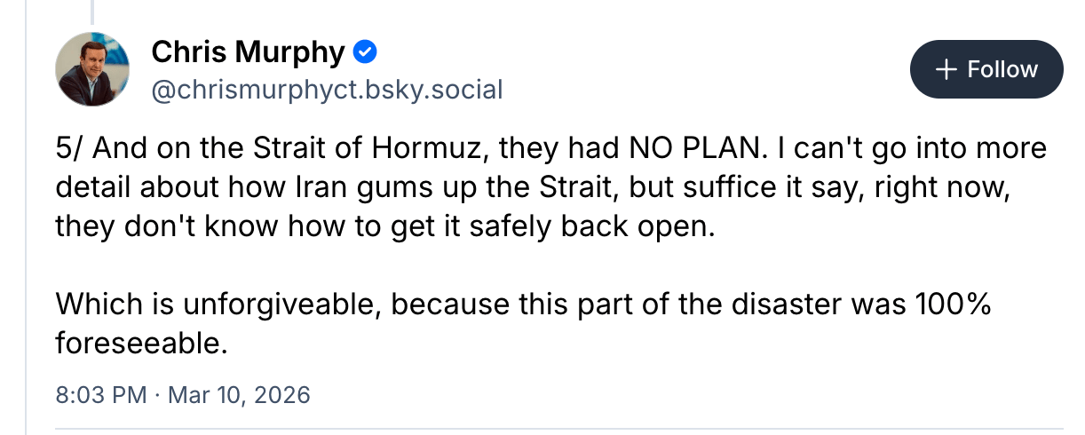 According to Sen. Chris Murphy (D-CT), the Trump administration went into this war without considering how it would affect the global oil supply and without a plan to keep the Strait of Hormuz open.