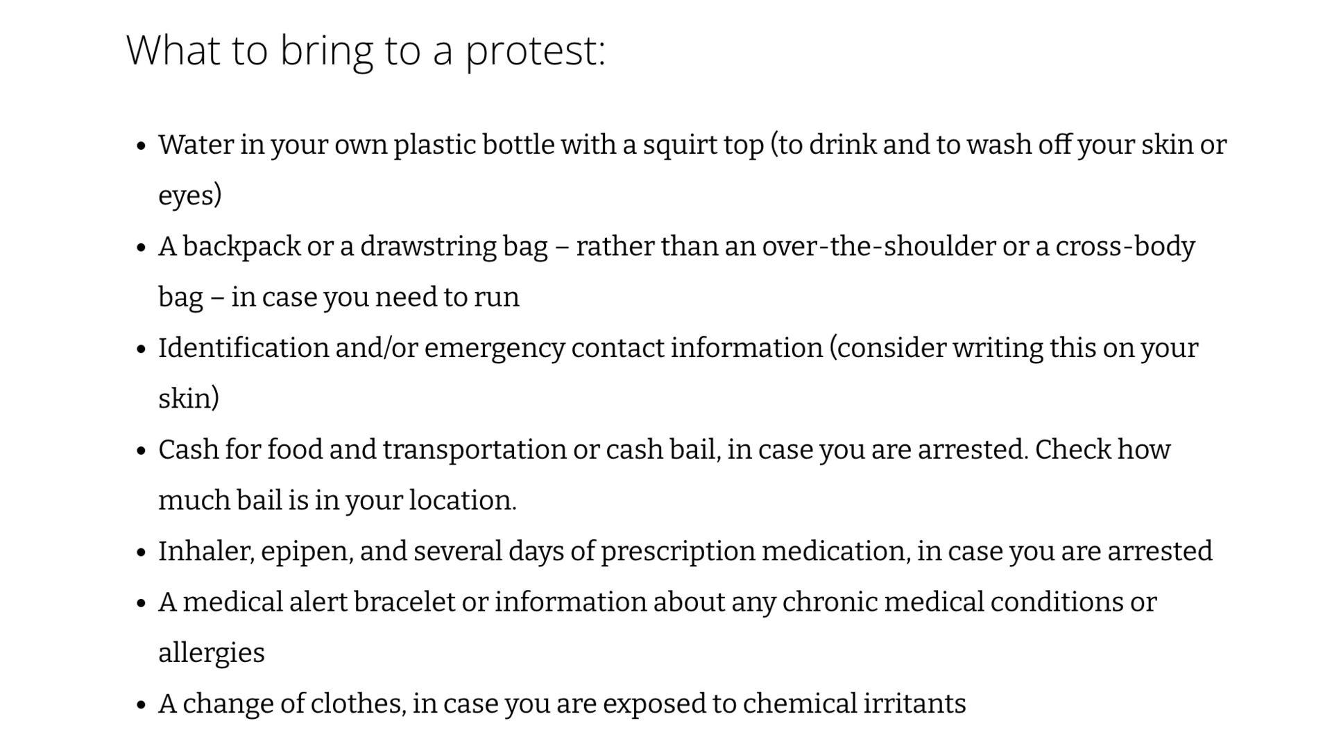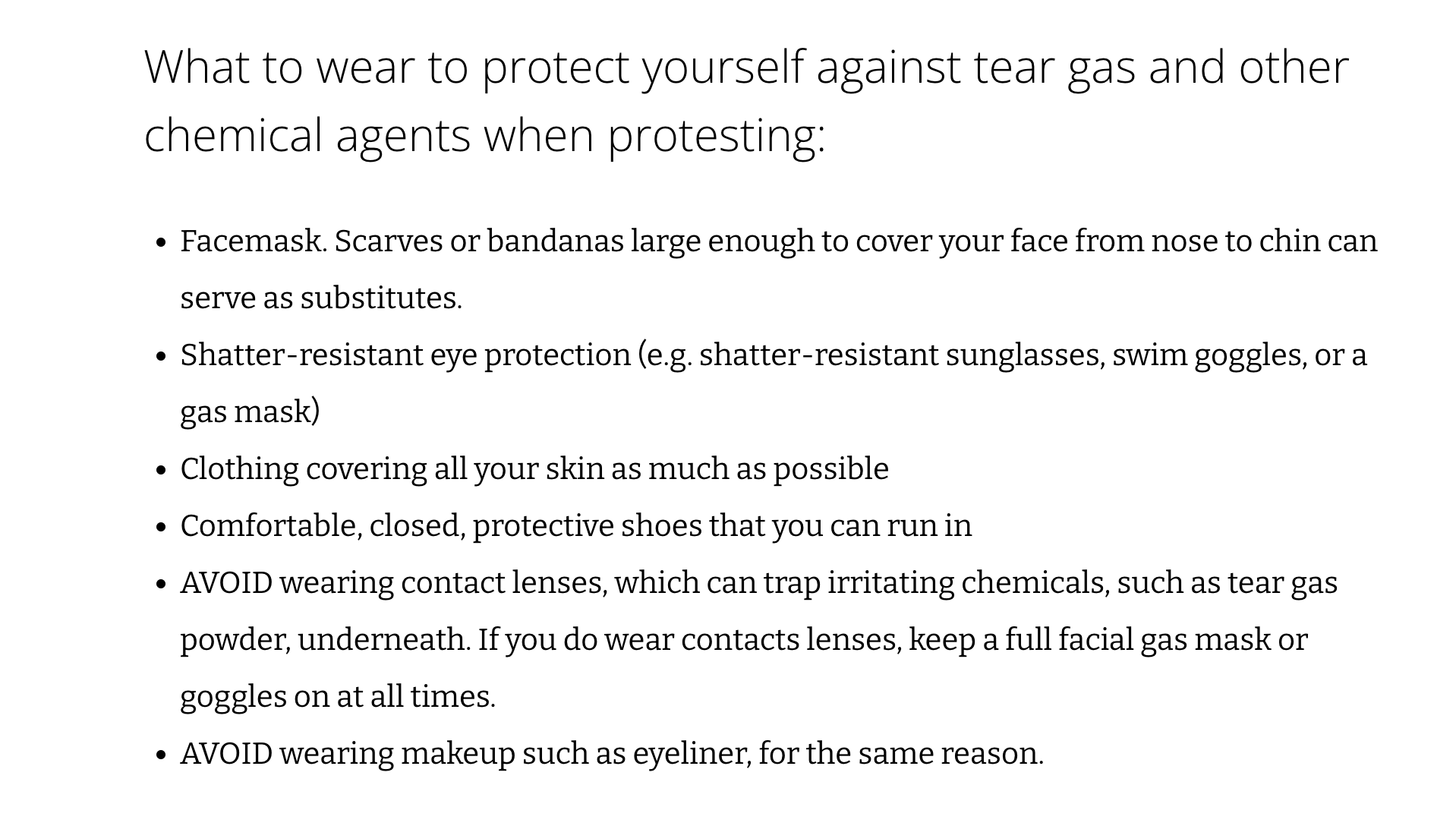 Experienced activists have also pointed out that wearing head protection, even something as basic as a bike helmet, is a must when protesting, as head injuries are often beyond the skill of street medics to treat.