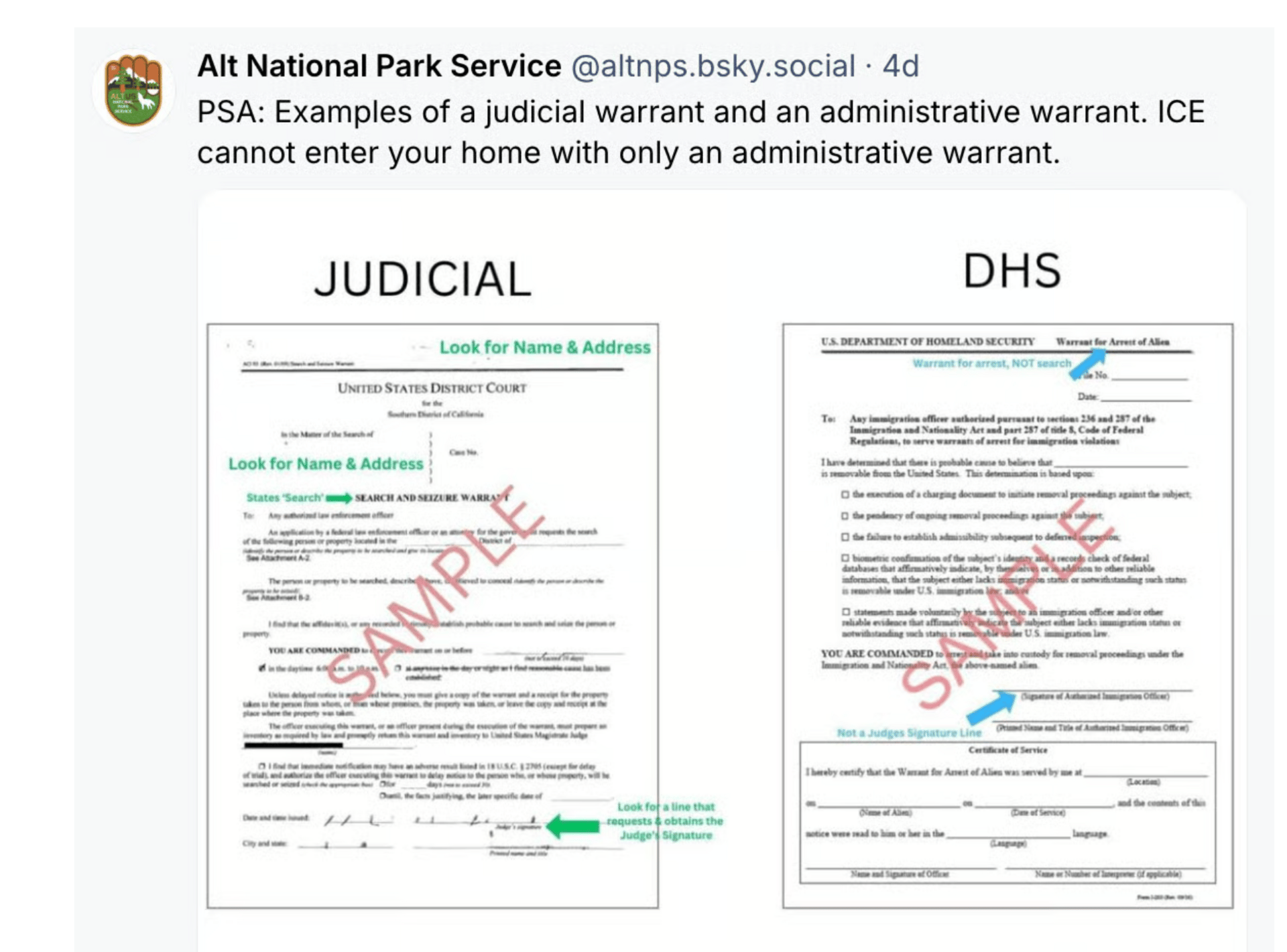 If you’re in a home or private business, yours or anyone else’s, the owner of the premises has the right to ask ICE to leave. The Fourth Amendment requires agents to have a judicial search warrant—signed by a judge—to enter a private area, so make sure not to fall for them flashing a fake administrative warrant and telling you it’s a search warrant. The difference between these two warrants? One is issued by a judge after determining that there is probable cause to justify an arrest/search. The other is a boilerplate form that ICE fills out in their car and signs themselves. The former has the force of law behind it; the latter does not.